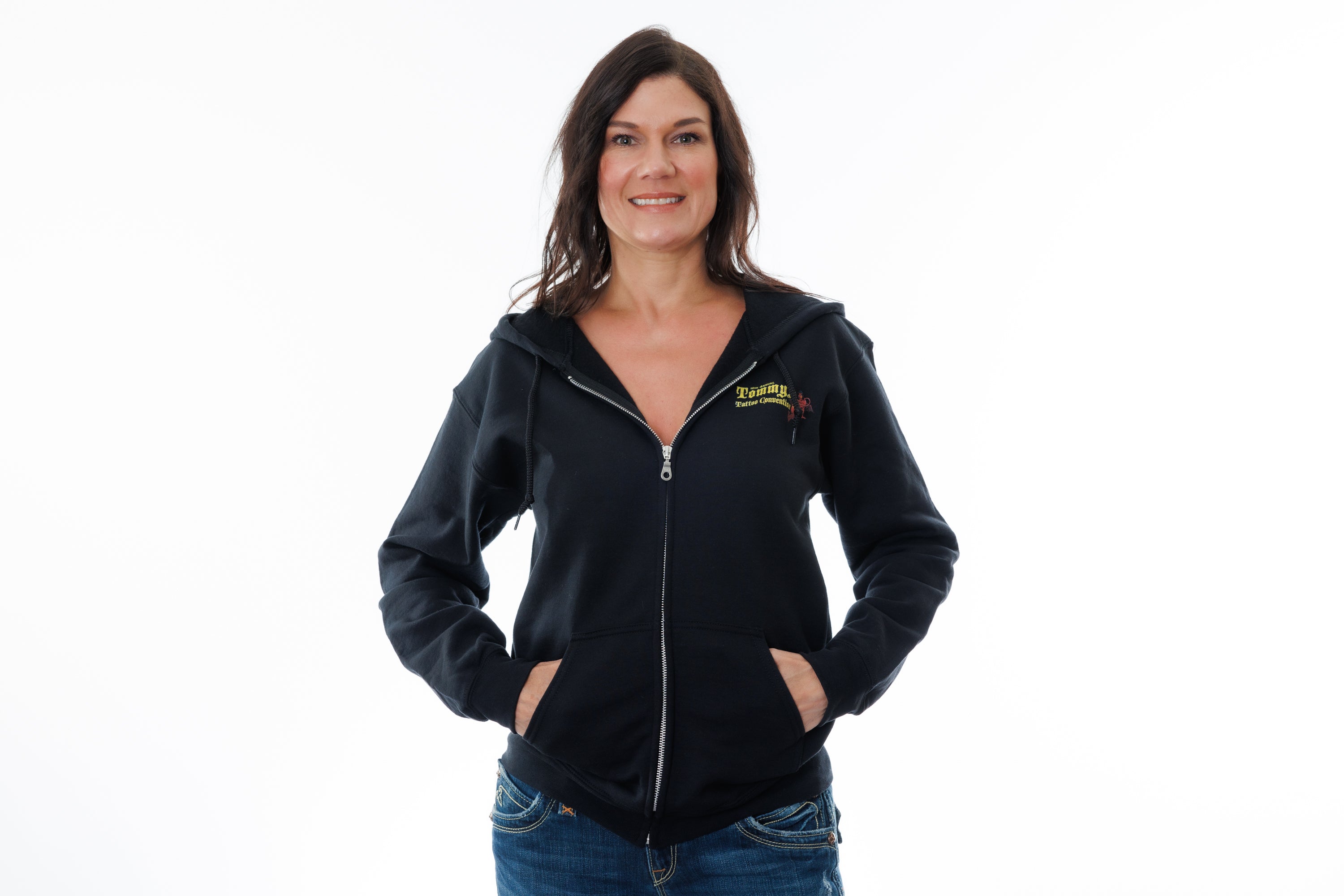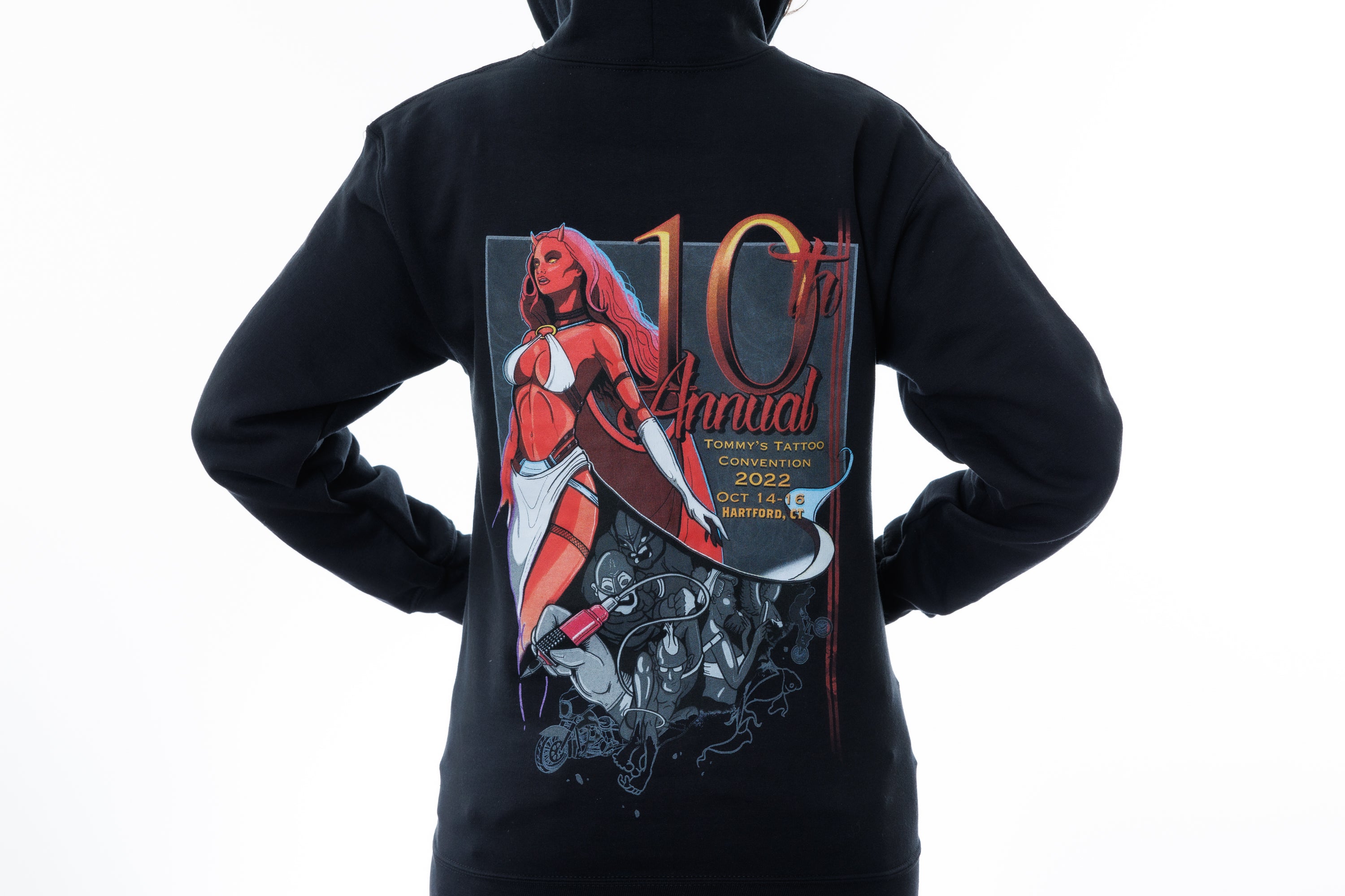 Limited edition 10th Annual Tommy's Tattoo Convention black zip up sweatshirt designed by StarBrite pro team artist Jason Piraino