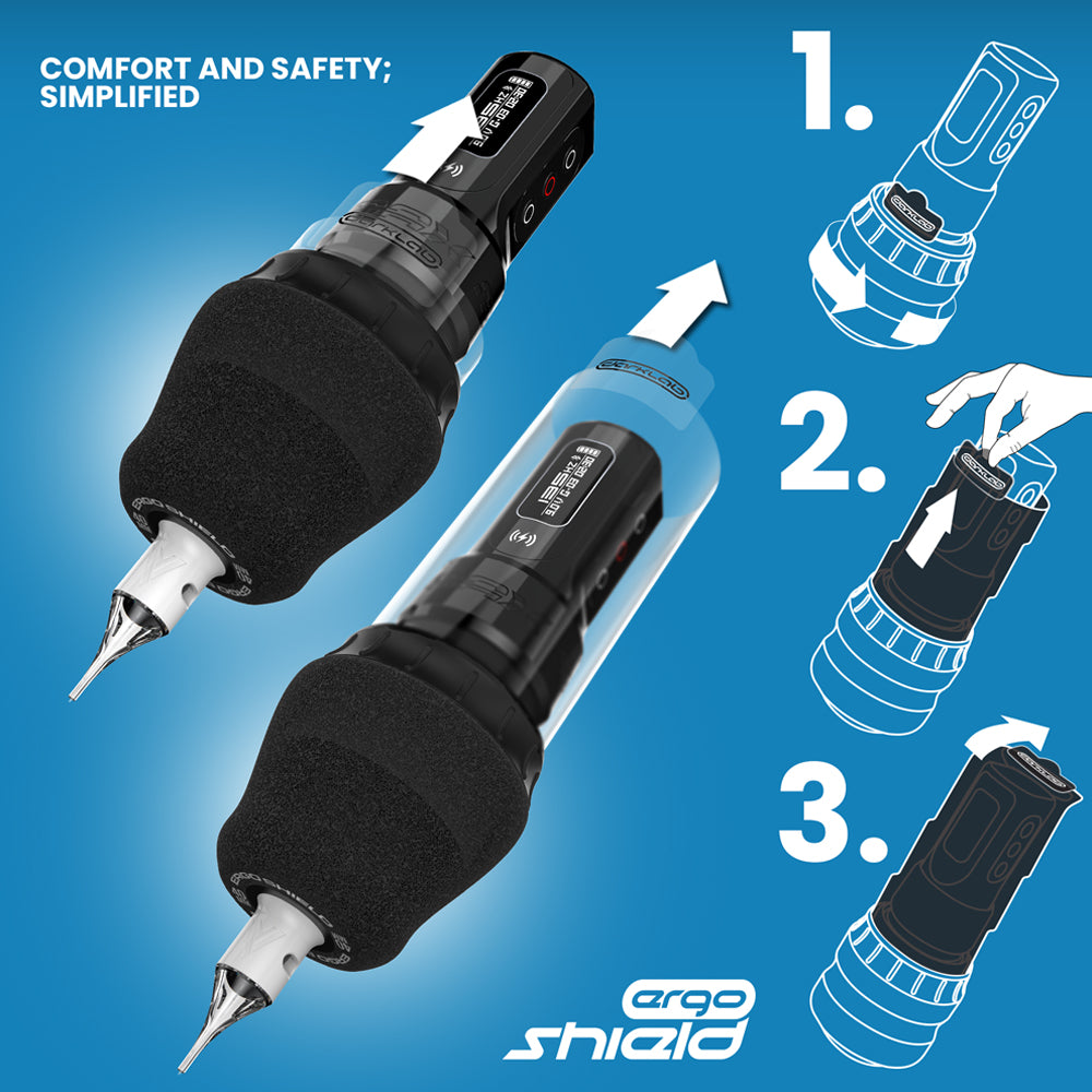 Take advantage of the ErgoShield’s versatility. These grips work with any Darklab wireless machine. They’re also compatible with most standard tattoo needles. You can also easily adjust your needle depth on the fly without risk of tearing thanks to the ErgoShield’s free-spinning barrier system.