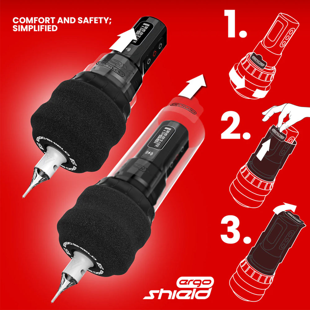 Take advantage of the ErgoShield’s versatility. These grips work with any Darklab wireless machine. They’re also compatible with most standard tattoo needles. You can also easily adjust your needle depth on the fly without risk of tearing thanks to the ErgoShield’s free-spinning barrier system.