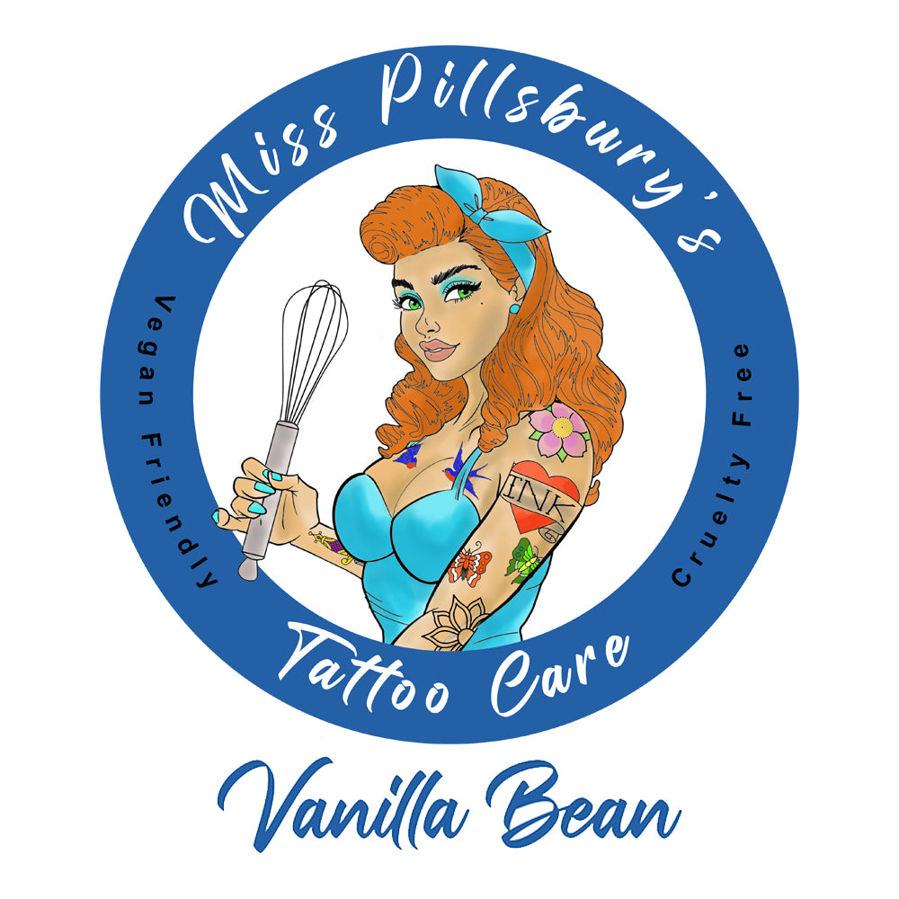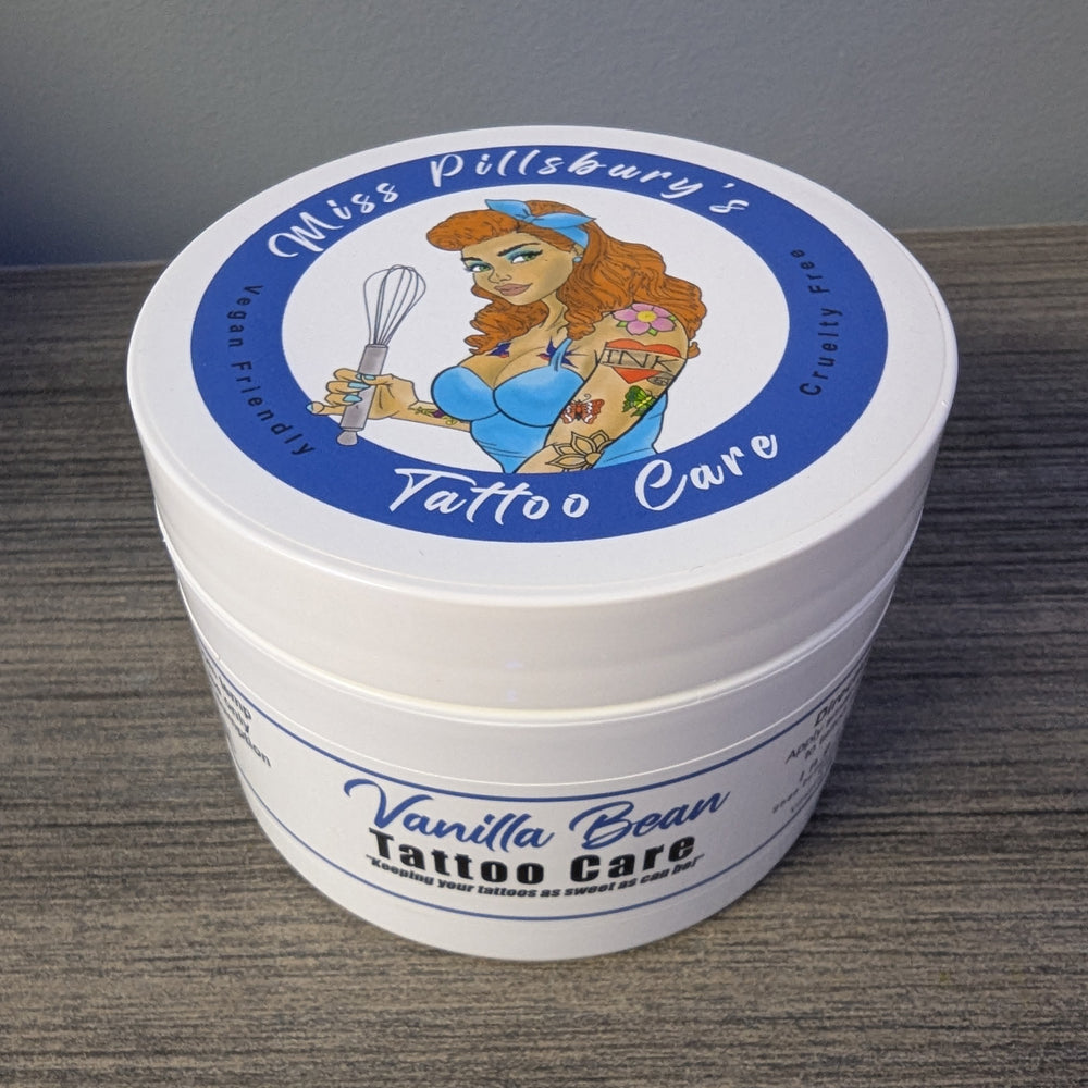 Miss Pillsbury's tattoo Care their newest scent Vanilla Bean! Vanilla Bean scent is the perfect balance between their naturally scented and their other scented products. Originally developed as an aftercare substitute to petroleum-based products this butter like aftercare also works great during the tattoo process! Helps alleviate redness and swelling during the tattooing process and will NOT remove the stencil.